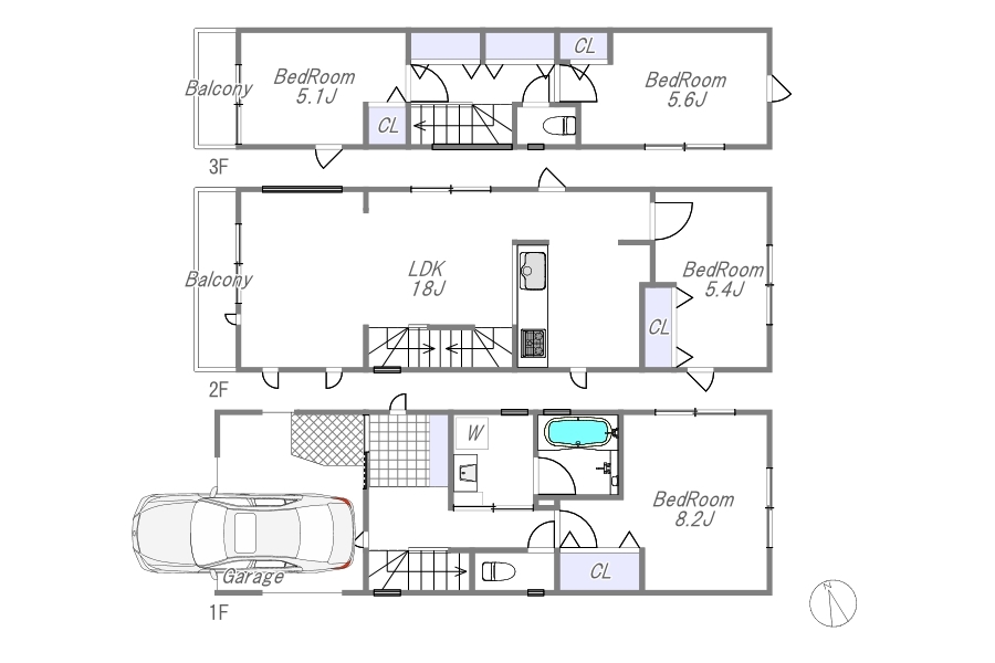 【ゆとりある間取りプラン!】延床100㎡超のゆとりある間取りプラン!全居室収納付き!3階の廊下収納など収納スペースも豊富!